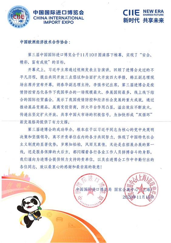 第三届中国国际进口博览会于11月10日圆满落下帷幕,实现了“安全、精彩、富有成效”的目标,我会作为进博会合作伙伴,为助力进博会成功举办做出了应有贡献,并得到了商务部中国国际进口博览局的高度认可。