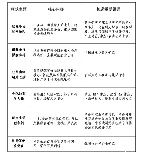 为助力企业突破发展瓶颈,中国建筑装饰协会联合新力18体育,倾行业顶级资源打造“出海战略攻坚研修班+国际市场项目对接会”,以前所未有的“系统性知识赋能+官方项目直通+实战经验复制”模式,助企业抢占欧亚市场先机。