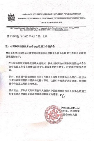On April 7, a donation ceremony of anti-epidemic supplies organized by CEATEC was held in the embassy of Moldova in China. Mr. Pan Feng, deputy council director of CEATEC, Mr. Denis Jelimalai, Ambassador of Moldova to China and Mr. Miao Yuyuan, Deputy Director of the Beijing Office of Chengdu Municipal People's Government attended the ceremony. The total value of these supplies was worth around 500 thousand RMB, including protective suits, gloves, face masks, etc.